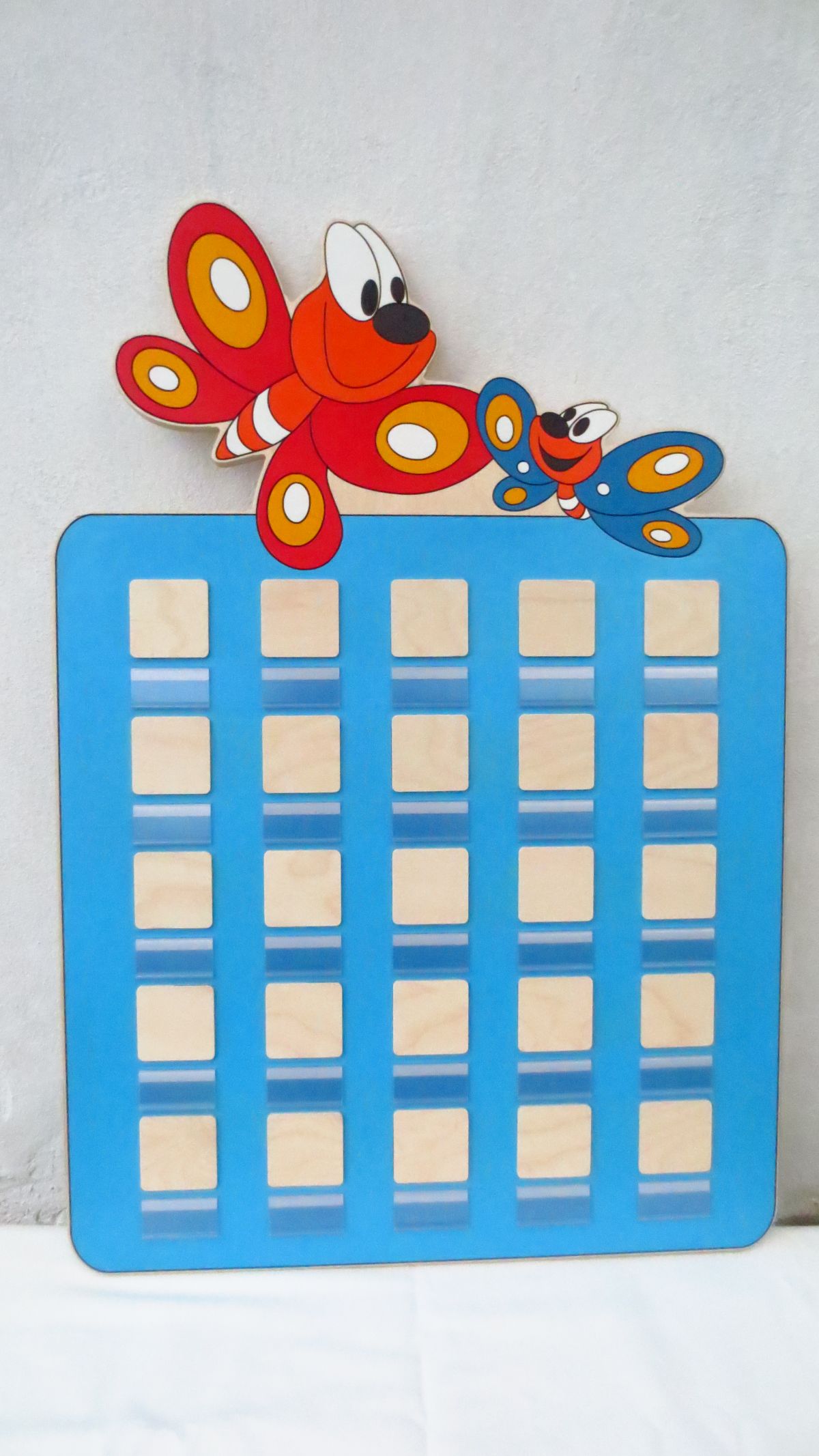Tabule Jmenovník, vyrobená z kvalitního vrstveného dřeva, je určená k lepší identifikaci a orientaci dětí ve školce. Do jmenovky se zasune jméno dítěte a na čtvereček vystupující z tabule nad jménem se nalepí obrázek přiřazený příslušnému žáčkovi. Tabule obsahuje 25 jmenovek a zároveň slouží i jako velmi pěkná dekorace. Rozměry, desing a počet jmenovek můžeme, po dohodě, upravit a zhotovit za příplatek dle přání zákazníka.