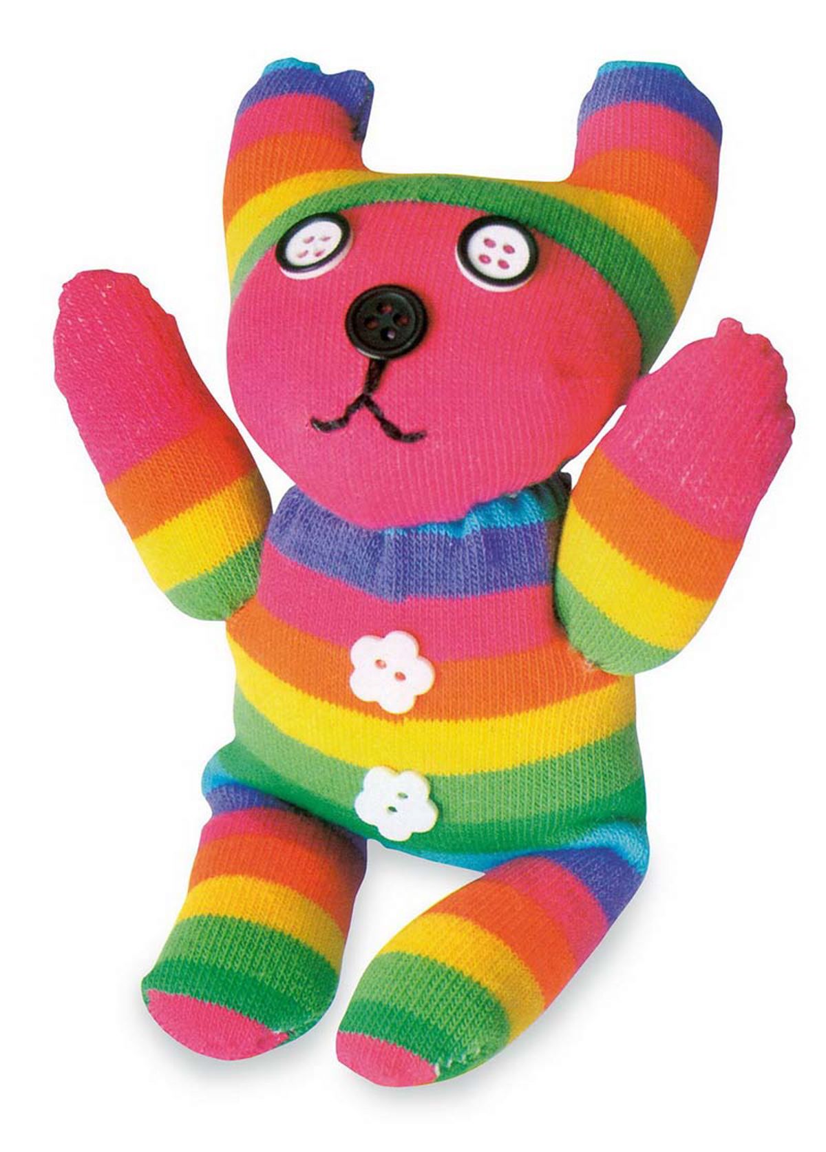 Zde se narodil velmi zvláštní pestrobarevný medvídek. Z barevně pruhované ponožky, měkkého výplňového materiálu, nití, knoflíků a jehel ( vše zahrnuto v ceně ) si šikovné ruce vyrobí medvěda na mazlení. Včetně návodu.